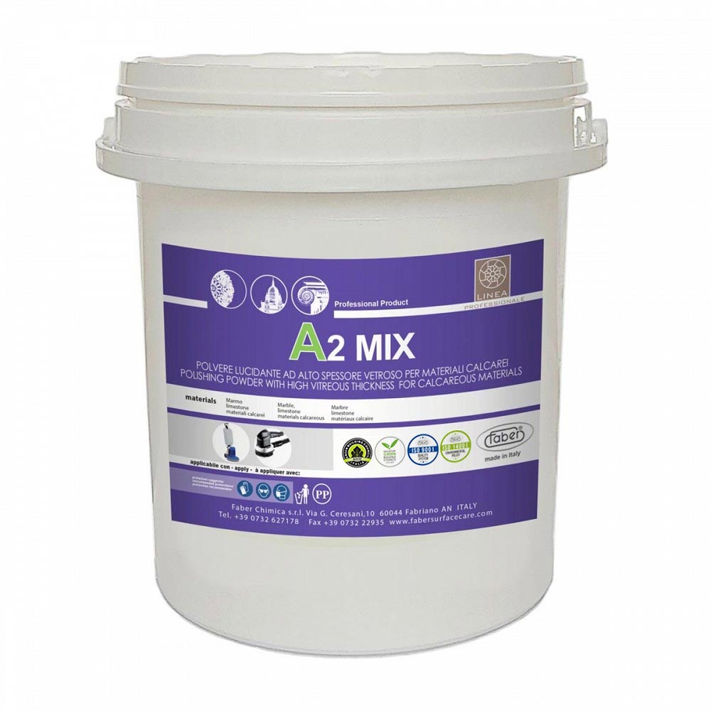 A2 MIX est une poudre de polissage mouillée à hautes performances, convenable pour le polissage de tout type de marbre et de matériau calcaire en général, tels que limestone, travertin, agglomérés marbre-ciment et agglomérés marbre-résine. Sa formule permet d’obtenir des résultats excellents en termes de netteté et d’épaisseur de la brillance donnée à la surface traitée, qui se caractérise par un effet vitreux marqué.