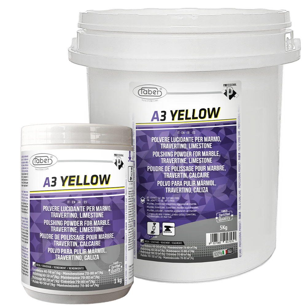 A3 YELLOW est une poudre de polissage humide haute performance adaptée à tous les types de marbre, travertin, marbre-béton et agglomérés de marbre-résine. Sa formule permet d’obtenir d’excellents résultats en termes de netteté et d’épaisseur de brillance de la surface traitée.