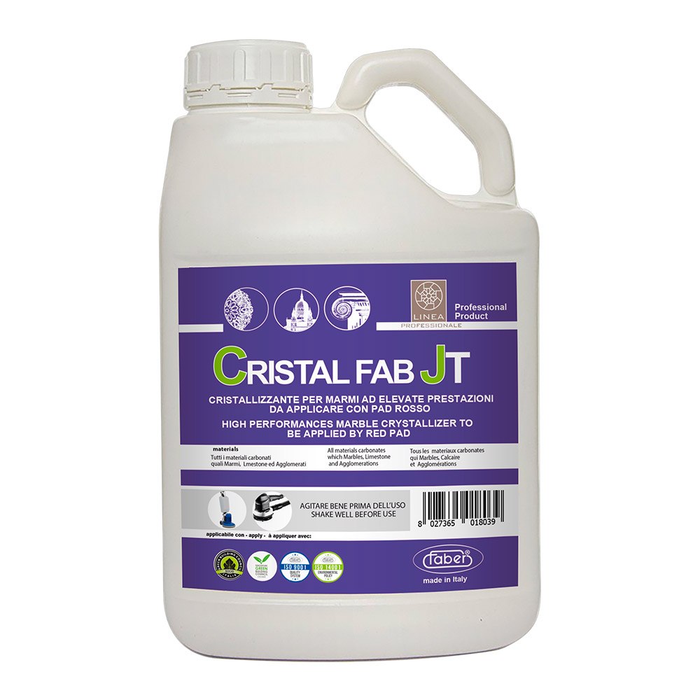 CRISTALFAB JT est un produit liquide à faible acidité, prêt à l’usage, à utiliser pour la cristallisation des marbres et des matériaux calcaires. La cristallisation est un traitement particulier qui permet de rétablir l’aspect brillant des surfaces en calcaire quand celles-ci ont perdu une partie de leur lustre d’origine, généralement à cause de l’usure et d’une circulation piétonne importante à laquelle elles sont soumises.